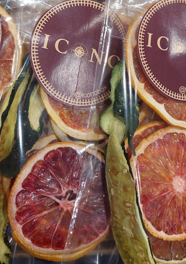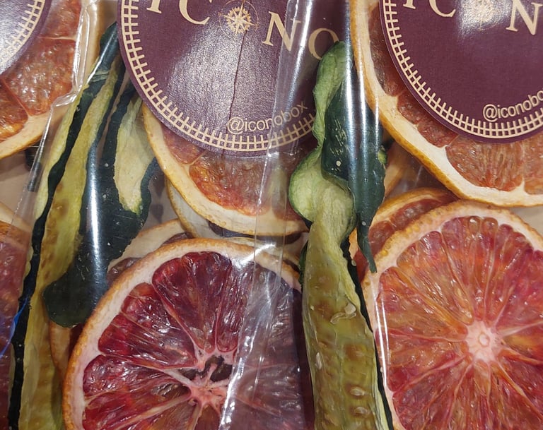 Bolsas de celofán grueso, con adhesivo para: rodajas enteras de MIX de pepino, cítricos u otras frutas deshidratadas. O rodajas enteras de un solo cítrico.